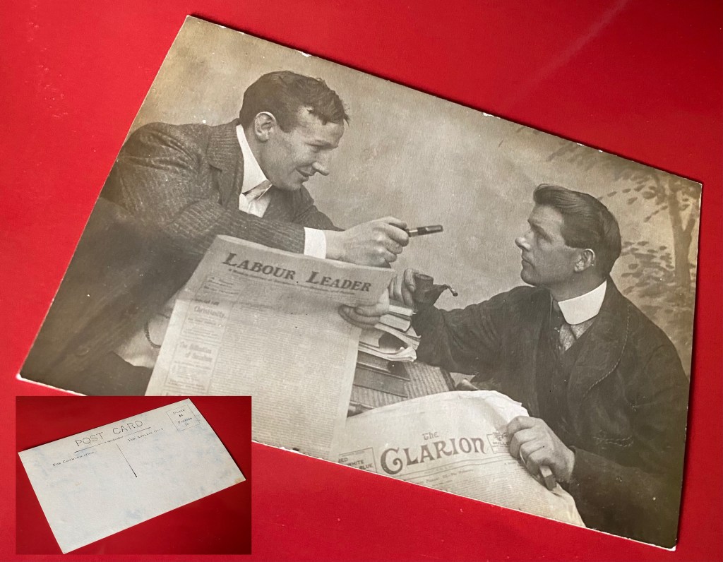Interestingly, although the photograph looks as though it may have been a promotional image of some sort, it was printed as a postcard. The example shown here was never used. And as to date: digitised copies of both papers in the British Newspaper Archive show that the masthead of the Clarion pictured was in use from April 1894 to August 1914; that of the Labour Leader from 1903 until well after the first world war. So the picture can be dated to some time between 1903 and August 1914 when both mastheads were in use – and when the political differences between the two papers were at their height.