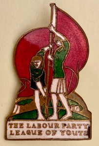 The date of the badge shown here is not known, but the design strongly suggests a fairly early date in the Labour League of Youth’s existence. Once adopted, it appears to have remained unchanged until the organisation was disbanded in the wake of the 1959 general election. Manufactured by the well-known badge maker Thomas Fattorini, the red, white and green-enamelled badge depicts two figures raising a scarlet standard on a grassy hill, above the name of the organisation.