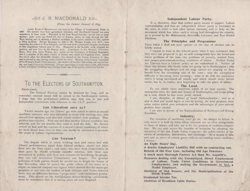 James Ramsay MacDonald fought his first parliamentary election in 1895. The Independent Labour Party had been founded just two years earlier, and though not a founder member, MacDonald had joined early on after gaining political experience as a Liberal. The election leaflet shown here was produced for his attempt to gain the Southampton seat on behalf of the ILP.