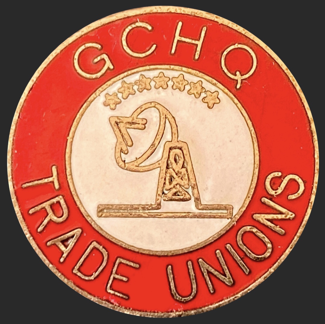 The picture here shows one of numerous badges, plates and other items of memorabilia produced to support and promote the campaign, many of which were sold at the annual rallies held in Cheltenham by the TUC and civil service unions throughout the long years of the dispute and at events in which the GCHQ trade unions’ travelling roadshow took part. This example is in brass with red and white enamel; it has the manufacturer’s mark ’ADB’ on the back.