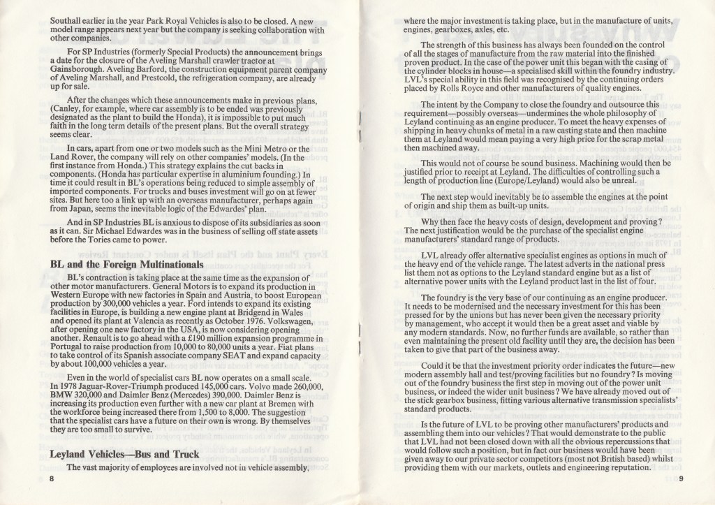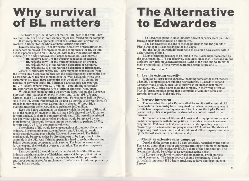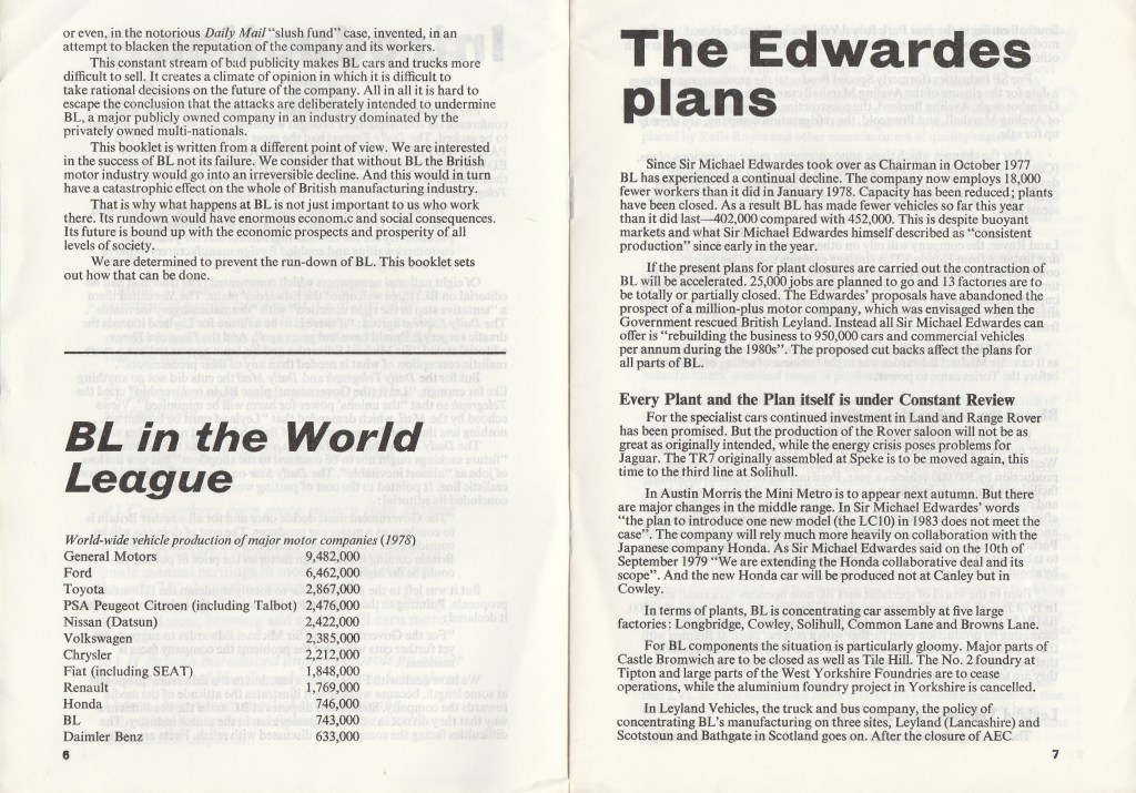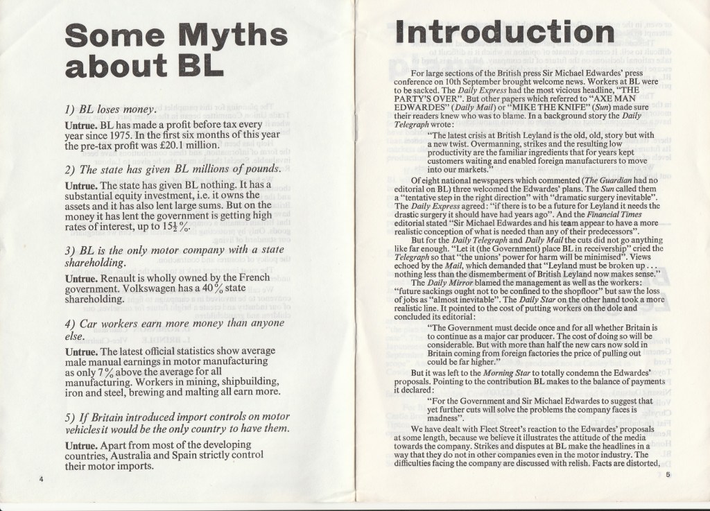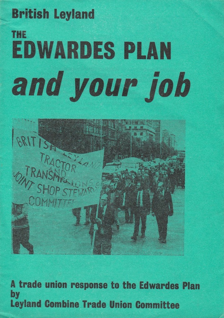 The pamphlet, which is reproduced in full below, had been drawn up and published by the Leyland Combine Trade Union Committee, and signed by its four leading lay officials, including Derek Robinson the committee’s chair and convenor at Longbridge. Already a well-known figure, ‘Red Robbo’, as he was dubbed by much of the media, was singled out and dismissed for the criticisms of British Leyland and its management contained in the pamphlet, leading to a series of unofficial walkouts in his support.
