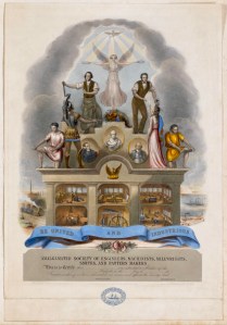 For trade unionists at the time, the acquisition of a trade union emblem was no small matter. Robert Leeson, the author of a now fifty-year-old book on the topic, wrote: ‘For a mid-Victorian worker to pay 3s a copy plus 7s for a frame was quite something, but thousands did. In 1857, the iron-founders’ secretary is reported to have threatened to resign if he did not get a commission on emblem sales.’ Hung on the wall at home, the emblem was a matter of pride: serving as a membership certificate, it was a symbol available only to those who had completed their apprenticeship and were in good standing with their peers. It was, too, a reminder for the union member and his family of the important friendly society benefits that membership brought with it. As Leeson pointed out, such emblems hung ’on parlour and club room walls well into the twentieth century’, but few new examples were commissioned after 1900, and you would be lucky today to find one outside a museum or specialist archive.