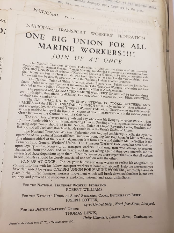 On my first research trip to the Modern Records Centre I wanted to see the broadest range of documents possible, including the Sarah Maitland Hamilton collections that related to the Industrial Syndicalist Education League (ISEL), minutes and files of the NSFU and the publications of the BSU and its successor union the Amalgamated Marine Workers Union (AMWU). These two groups were the largest maritime unions of the early twentieth century and had a bitter and often confrontational rivalry. The BSU had been formed as a breakaway union from the NSFU and later merged with the Ship Stewards Union, another NSFU breakaway based largely in Liverpool, to become the AMWU. They were industrial unionists in outlook, in that they unionized all workers involved with shipping, and generally more closely aligned to the interests of the Labour Party and TUC than the NSFU. The BSU/AMWU saw themselves as an independent-minded union of working-men of the sea who had broken free from the authoritarian leadership of NSFU leader Havelock Wilson. While they were not explicitly syndicalist the union often used syndicalist rhetoric, identifying themselves as ‘One Big Union’ for maritime workers. The political ideology of the union can be characterized as both dual unionist and anti-Havelock Wilson.