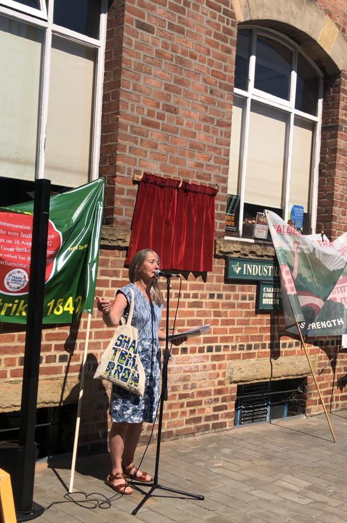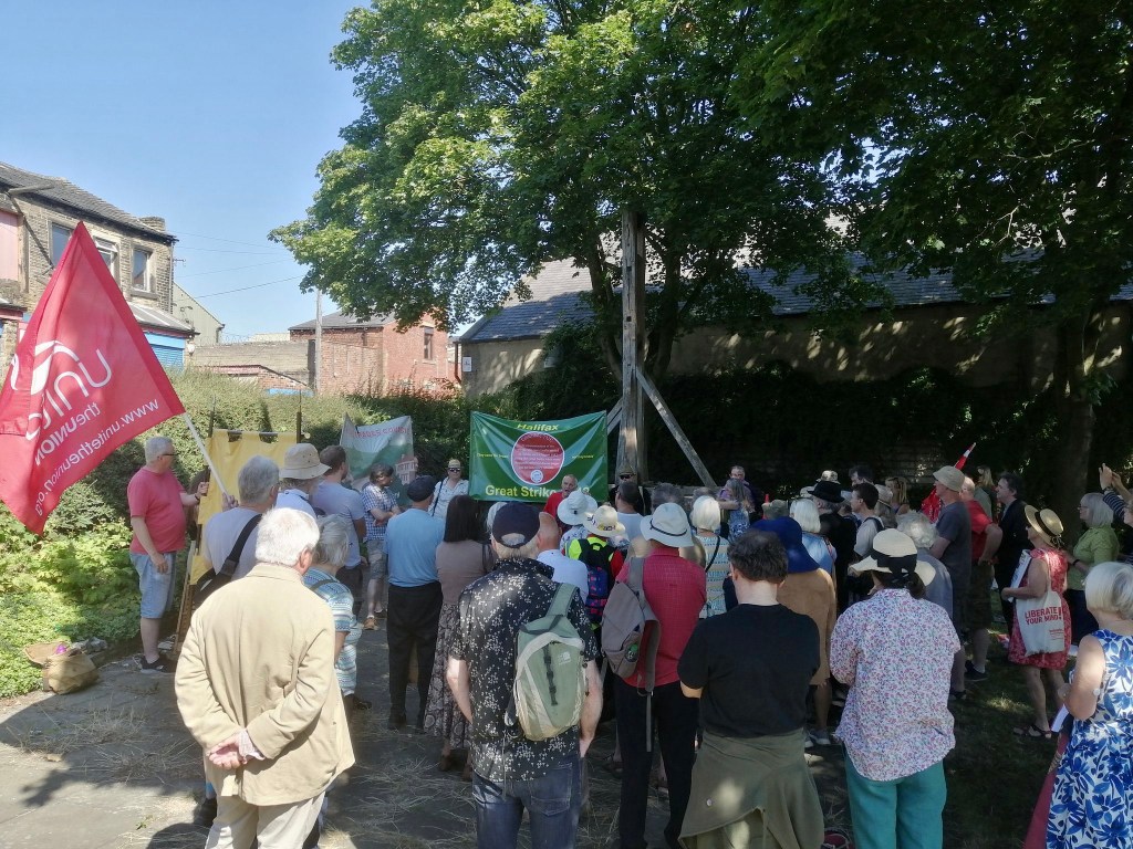 On the way to Halifax town centre, the crowd paused at the Halifax gibbet. Here, two rousing speeches from Jane Aitchison, President of Leeds TUC, and John Dunn of the Orgreave Truth and Justice Movement, inspired the crowd. Dunn reflected on the fact that it was on 1 August 1842 that 800 miners had come down into Halifax and made the call for a national mineworkers union for the first time, and gave a moving speech that reminded the crowd of how important it is to ensure that although we commemorate the history of general strikes, we also organize to ensure that ‘next time we win’. Aitchison, meanwhile, drew powerful links between that violence done by the gibbet in seventeenth and eighteenth century Halifax, and the violence being inflicted on working people today. It was particularly special to have Jane speak so powerfully at the event, given that she has recently overcome a bout of severe ill health. All who heard her speak were inspired by her words.