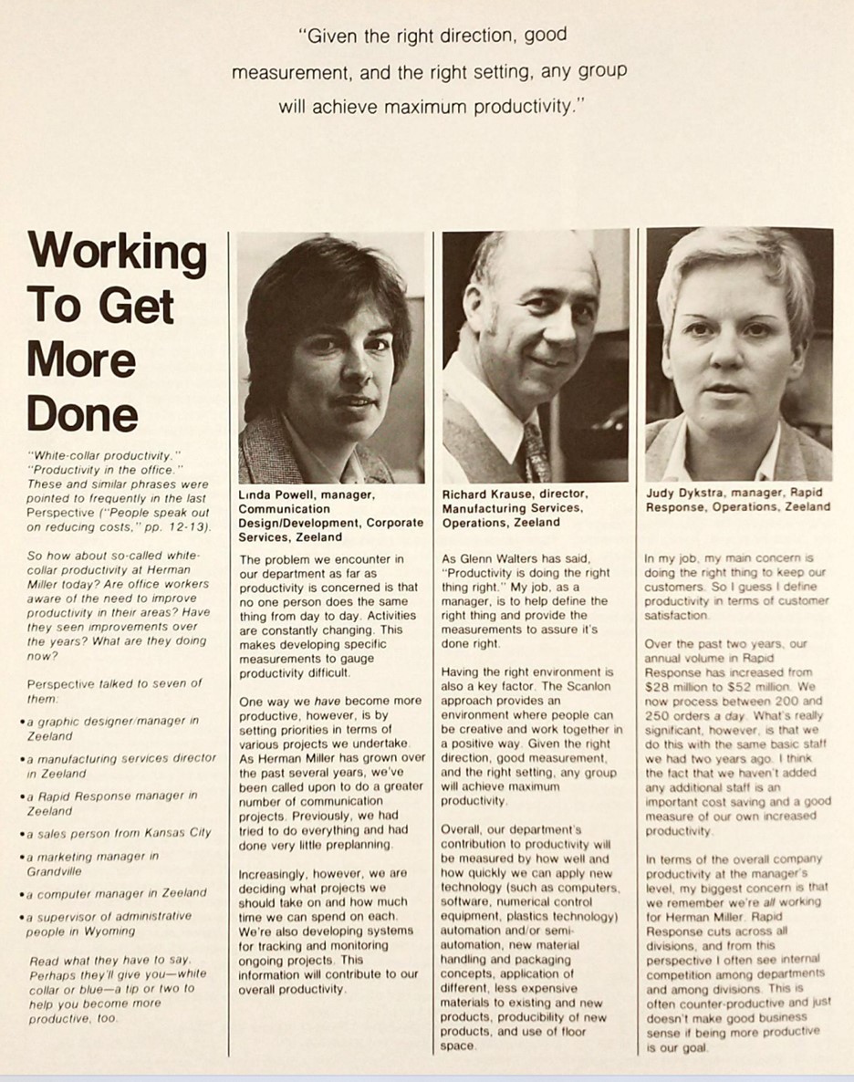 Beyond suggesting the existence of a core ideological framework, archival materials also show that these attitudes played out internally and externally in the construction, maintenance, and promotion of both the Scanlon Plan and the Action Office system. Language and concepts mobilized in internal documents regarding Herman Miller’s own production and its Scanlon Plan were also present in external materials promoting the Action Office system, suggesting a cohesive company outlook and understanding of labour, productivity, and the design of office spaces.