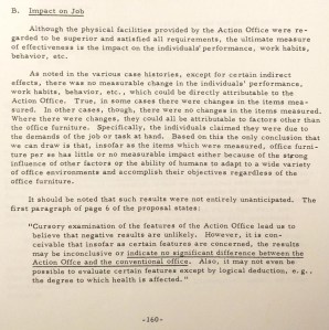 The archival trip funded in part by the Society for the Study of Labour History also bore additional, unexpected fruit including the unearthing of a 1966 evaluative study of Action Office I which concludes that the system provided limited improvement to worker productivity, and suggests that the efficacy of office systems might be impossible to measure. Such a conclusion would seem to contradict the voluminous promotional material for the subsequent Action Office II system, which argues for the system’s productivity advantages over other office furnishings.