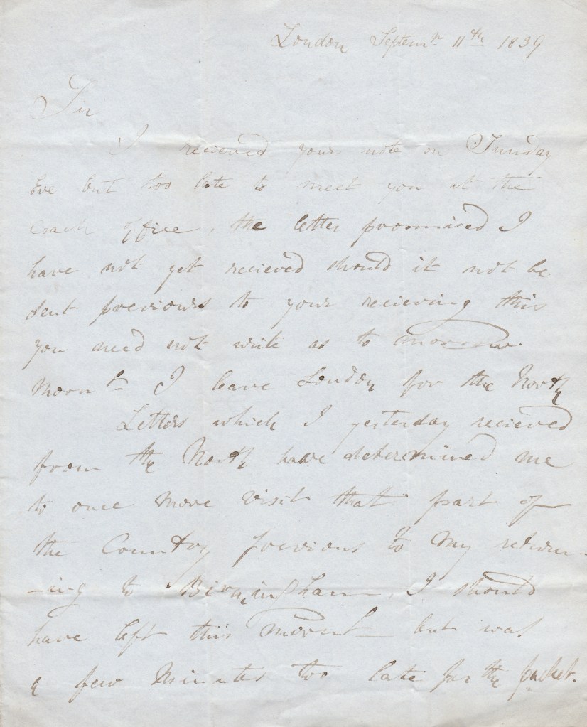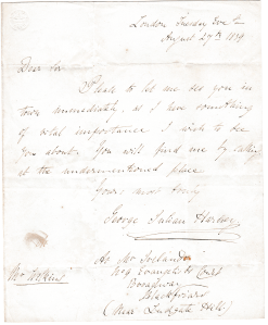 Sent from an address at Blackfriars in London, the letter, dated 27 August 1839, urges Wilkins: ‘Please to let me see you in / town immediately, as I have something / of vital importance I wish to see / you about. You will find me by calling / at the undermentioned place.’ [/ indicates a line break in the original].