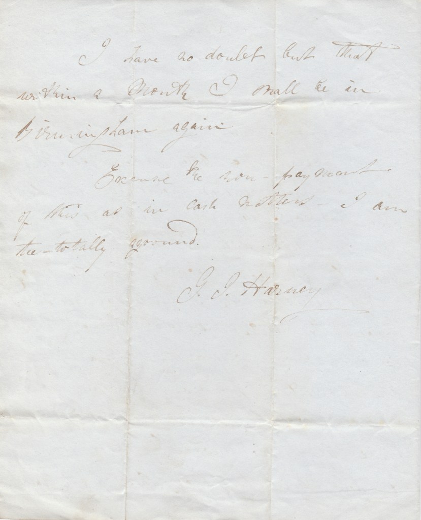 Whatever Harney’s desperation was at this point, it appears that no meeting took place. A second letter, shown in the image gallery below, and similarly addressed by Harney to Wilkins at his lodgings in the ‘Black Boy and Woolpack Inn, St Martin’s Lane, Near the Old Church, Birmingham’ is dated 11 September 1839. It opens: ‘I received your note on Tuesday eve too late to meet you at the coach office…’ He says Wilkins need not write to him in London as letters he had received from the North of England that morning ‘have determined me to visit that part of the country previous to my return to Birmingham.’ He adds: ‘I should have left this morning but was a few minutes too late for the packet.’ He concludes with a jokey apology for having failed to pay the postage on his letter: ‘Excuse the non-payment of this as in cash matters I am tee-totally aground.’