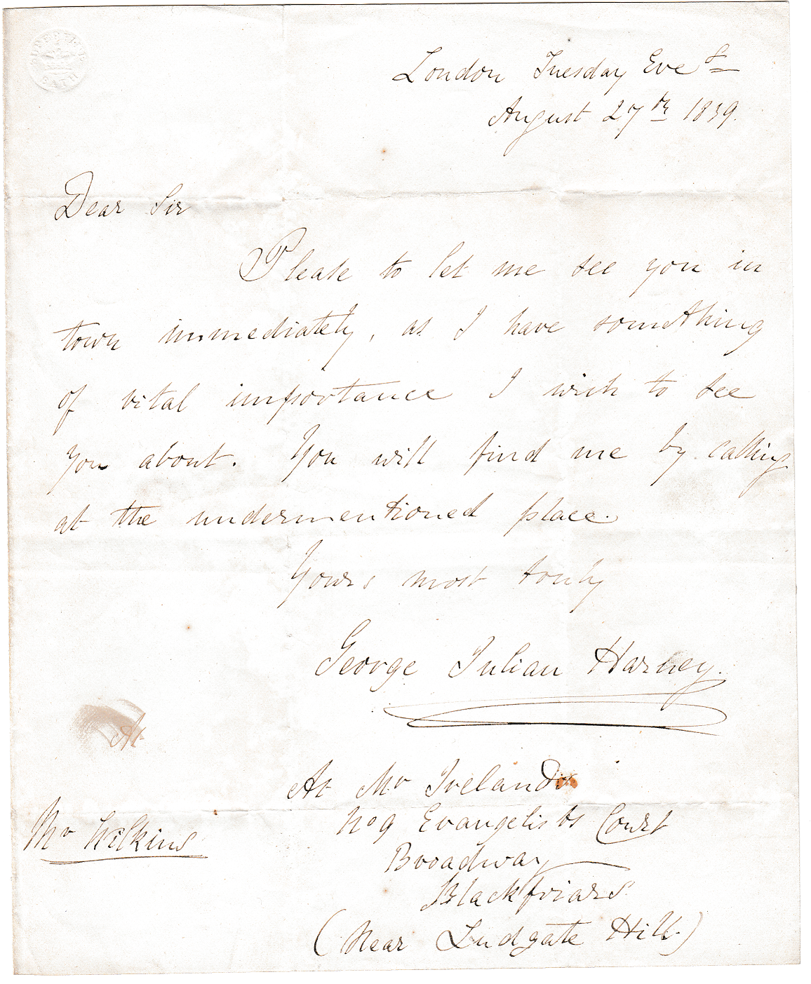 The letter shown here is filled with the angst of a man facing a possible gaol sentence and badly in need of his lawyer’s advice. Written by the Chartist George Julian Harney in August 1839, and addressed to a Mr Wilkins, the letter provides little detail of the topic Harney wanted to discuss, but its sense of urgency is clear in every word.