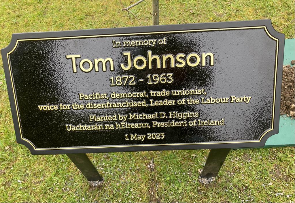 The President of Ireland, Michael D. Higgins, has planted a tree and unveiled a commemorative plaque in memory of trade union and labour leader Tom Johnson, author of the Democratic Programme of the First Dáil, at an event to mark the fiftieth anniversary of the Irish Labour History Society (ILHS).