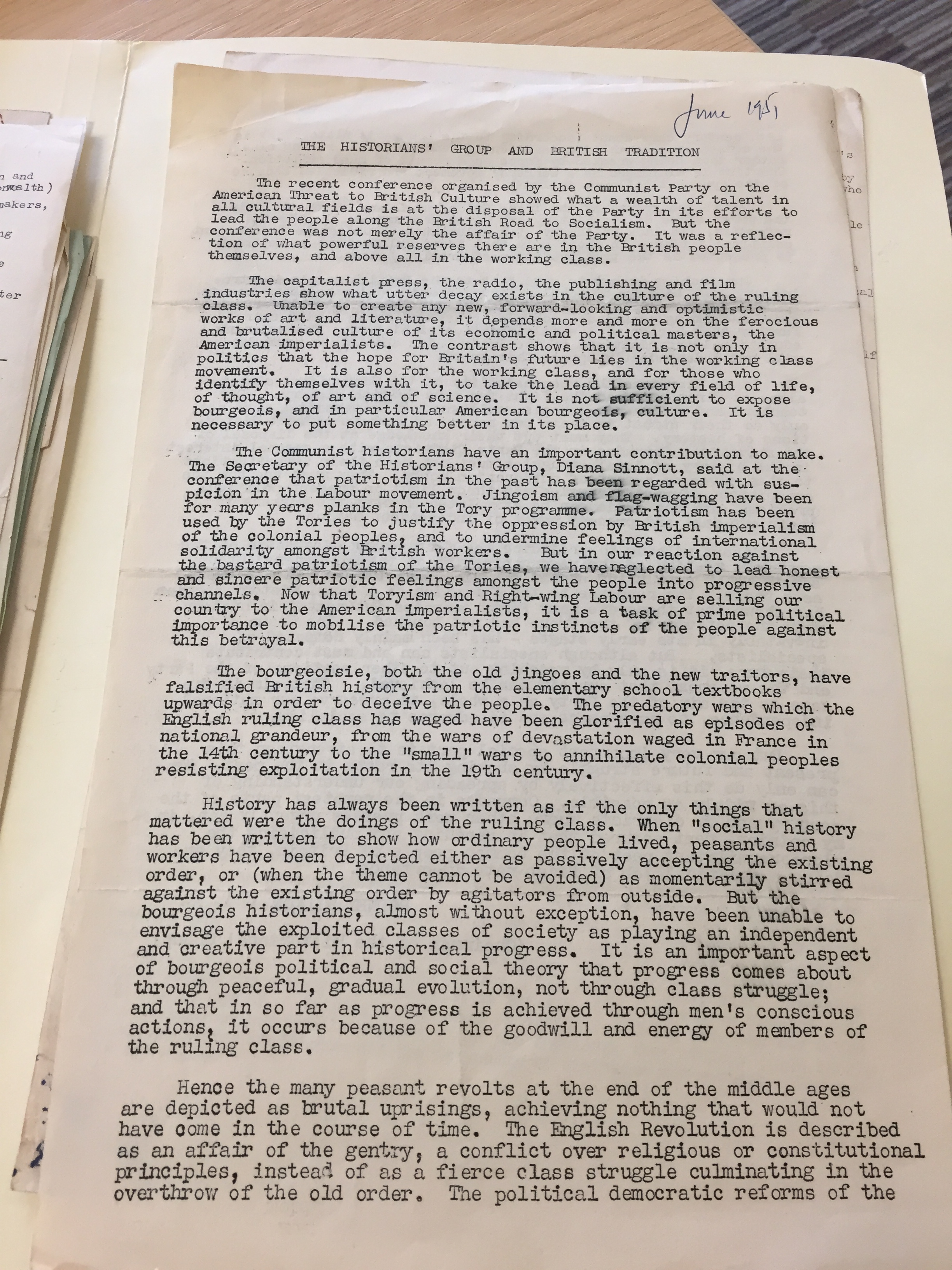 My first research trip was to the People’s History Museum in Manchester, which has been the major base for much of my thesis. Here, I examined many of the CPGB’s publications, including Communist Review and Labour Monthly, as well as internal party documents from the late 1940s and early 1950s that grapple with the party’s new policy program. Members of the CPHG were given a prominent role in articulating the party’s new flagship document, the British Road, and were regarded as the ‘jewel in the crown’ by the wider National Cultural Committee (NCC). [1] My aim was to examine to what extent the CPHG reflected and/or differed from the party in its representation of the ‘national-radical tradition’, so I chose to focus on the group’s internal minutes and correspondence, rather than its well-known published material, as much research has already focused on this area. I felt that the nuances and subtle misgivings over party direction would be better uncovered by examining the group’s public and private correspondence with the party centre. The group’s meetings were formative for the historians’ worldview – after all, Christopher Hill went as far as to suggest that his entire life’s work stemmed from discussions in the CPHG.[2]