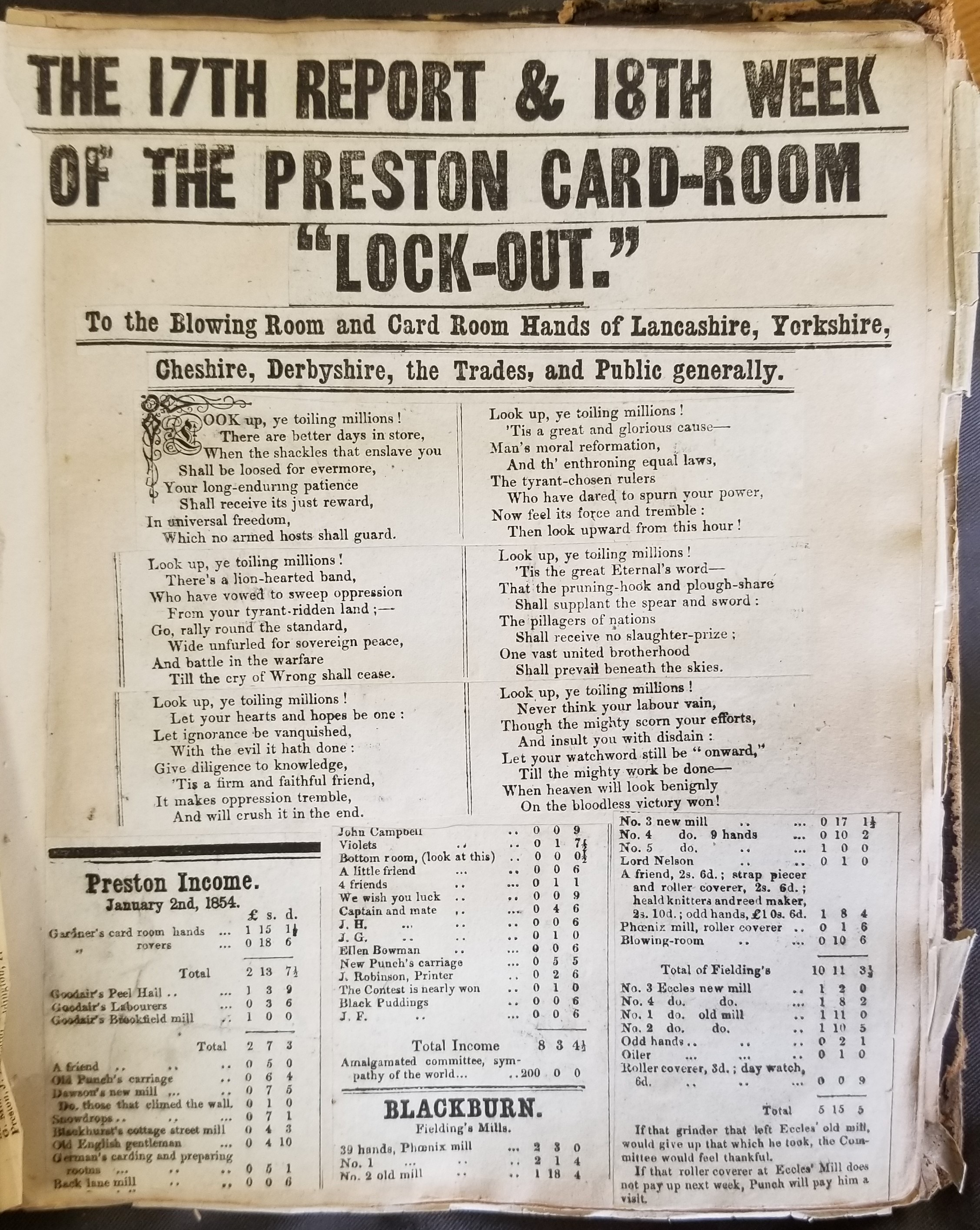 These publications called themselves balance sheets — they list donations to the locked-out workers from across the UK, and how the money was spent. We might call them circulars, subscribers’ lists, bulletins, updates etc. Each union produced its own, and they typically include an opening address, list of subscribers (full of rich, allusive nicknames), amounts in, and payments out. Many also include stirring verse and not-so-veiled threats to those who haven’t paid. Lancashire Archives has a good collection, although they don’t appear in the catalogue.