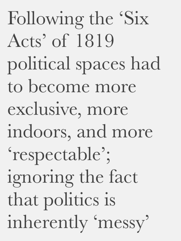A panel on crowds and space offered the opportunity to compare political meeting sites, headed by Mary O’Connor’s exploration of ‘Forum selection in the anti-corn law campaign of the 1820s’, which emphasised that choosing political meeting places relied on manipulation of legal loopholes and community memory. Likewise, Caitlin Kitchener’s archaeology-informed ‘Political palimpsests’ explored the creation of a people’s heritage on procession routes and platform meetings whereby ‘layers’ of memory from different protests and processions might be built up and up in post-Peterloo Manchester and Yorkshire. Dave Steele offered us an alternative type of ‘political feeling’ in ‘The Power of the Crowd’, exploring the practical considerations of outdoor meetings; from sore feet to hunger and thirst. Perhaps the most obvious but least discussed consideration in histories of people and processions is the necessity of toilets: fortunately female attendees attending radical processions were in the habit of carrying ‘bourdaloues’, or able to relieve themselves in nearby pubs.