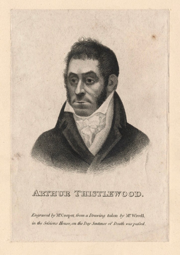 Arthur Thistlewood was born on 1 May in Lincolnshire. After working as a land surveyor, serving in the army and attempting to farm, bought with the help of his father, he moved to London in 1811, where he became a member of the Society of Spencean Philanthropists, an ultra-radical group inspired by Thomas Spence, who had argued for common ownership of the land. In 1816, Spence and other members of the Society tried to use a meeting at Spa Fields addressed by ‘Orator’ Henry Hunt to spark a revolutionary uprising. The attempt failed, and Thistlewood was one of four men charged with high treason. The trial collapsed when a jury refused to find a true bill against one of the four. He was, however, gaoled in 1817 after challenging the prime minister, Lord Sidmouth, to a duel. Thistlewood was the leading figure in the Cato Street conspiracy in 1820, planning to capture and execute the prime minister as a prelude to revolution. A police spy betrayed the conspirators, and in the course of their arrest, Thistlewood killed a police officer. Eleven men were convicted of high treason; Thistlewood was one of five to be hanged and subsequently beheaded at Newgate.