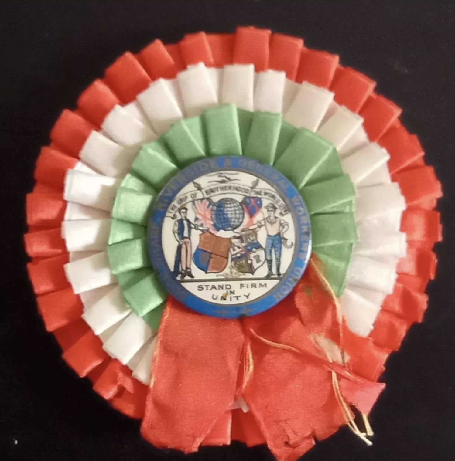 This fine rosette carries at its centre the badge of the Dock, Wharf, Riverside and General Workers’ Union. Originating as the Tea Operatives and General Labourers’ Association in 1887, the union played a central role in the London dock strike two years later, becoming that same year the Dock, Wharf, Riverside and General Labourers’ Union of Great Britain.