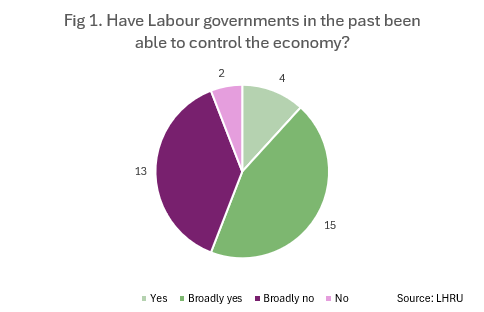 Asked ‘Have Labour governments in the past been able to control the economy?’, a slim majority said definitely or broadly yes (see fig 1). There was a similarly close split on the question of whether Labour governments generally leave the constitution unchanged: 18 said yes, and 16 said no.