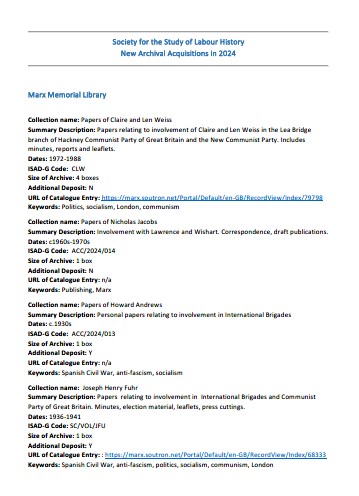 UK archives take in new labour history accessions every year. The SSLH-Archives and Resources Committee tracks these and publishes an annual guide for researchers. The latest guide, for 2024, has now been published and can be freely downloaded here.