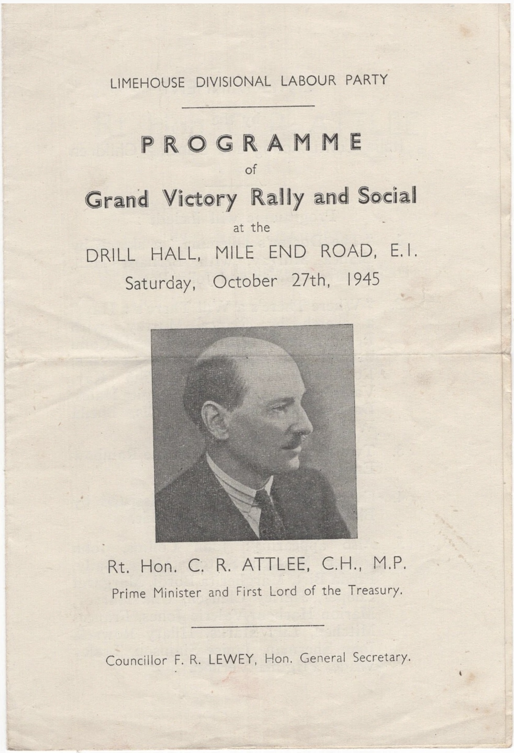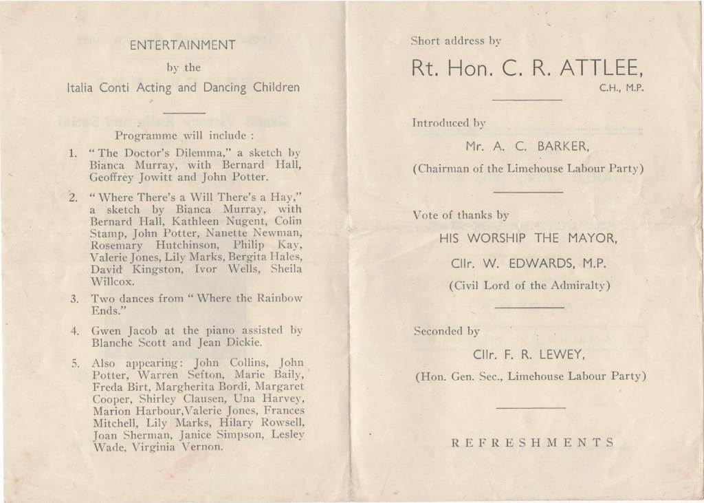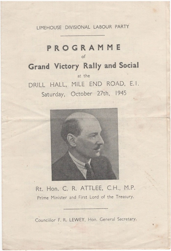 The leaflet shown here gives the programme for Limehouse Divisional Labour Party’s ‘Grand Victory Rally and Social’ at the Drill Hall in Mile End Road. Taking place on Saturday 27 October, it featured only a short address by the Prime Minister, then preparing for a trip to meet the new American President Harry Truman, but also gave time to local party worthies to speak.