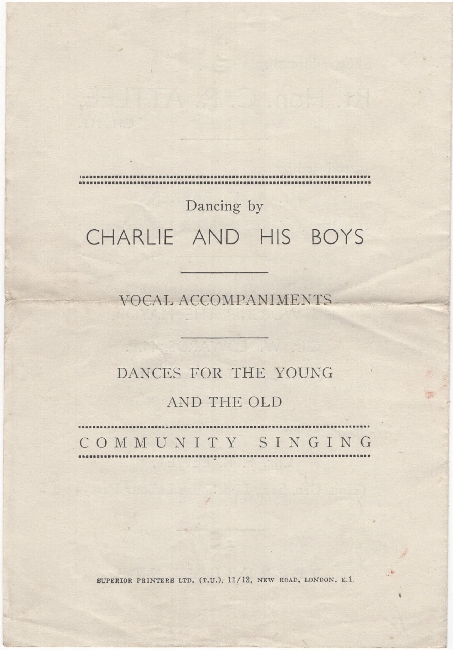 There would be, the programme promised, dancing to Charlie and His Boys, with ‘dances for the young and the old’, and ‘community singing’. The Italia Conti Acting and Dancing Children would also perform sketches, dancing and a musical performance. The cast of one sketch includes a young Nanette Newman, then eleven years old and on the verge of a long film career.