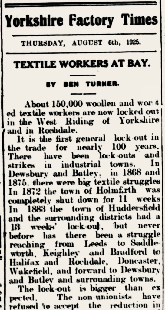 That July and August, more than 150,000 workers in West Yorkshire’s textiles industry came out on strike when at the urging of the Wool Employers Federation, the county’s mill owners announced plans to reduce wages for the second time that year.