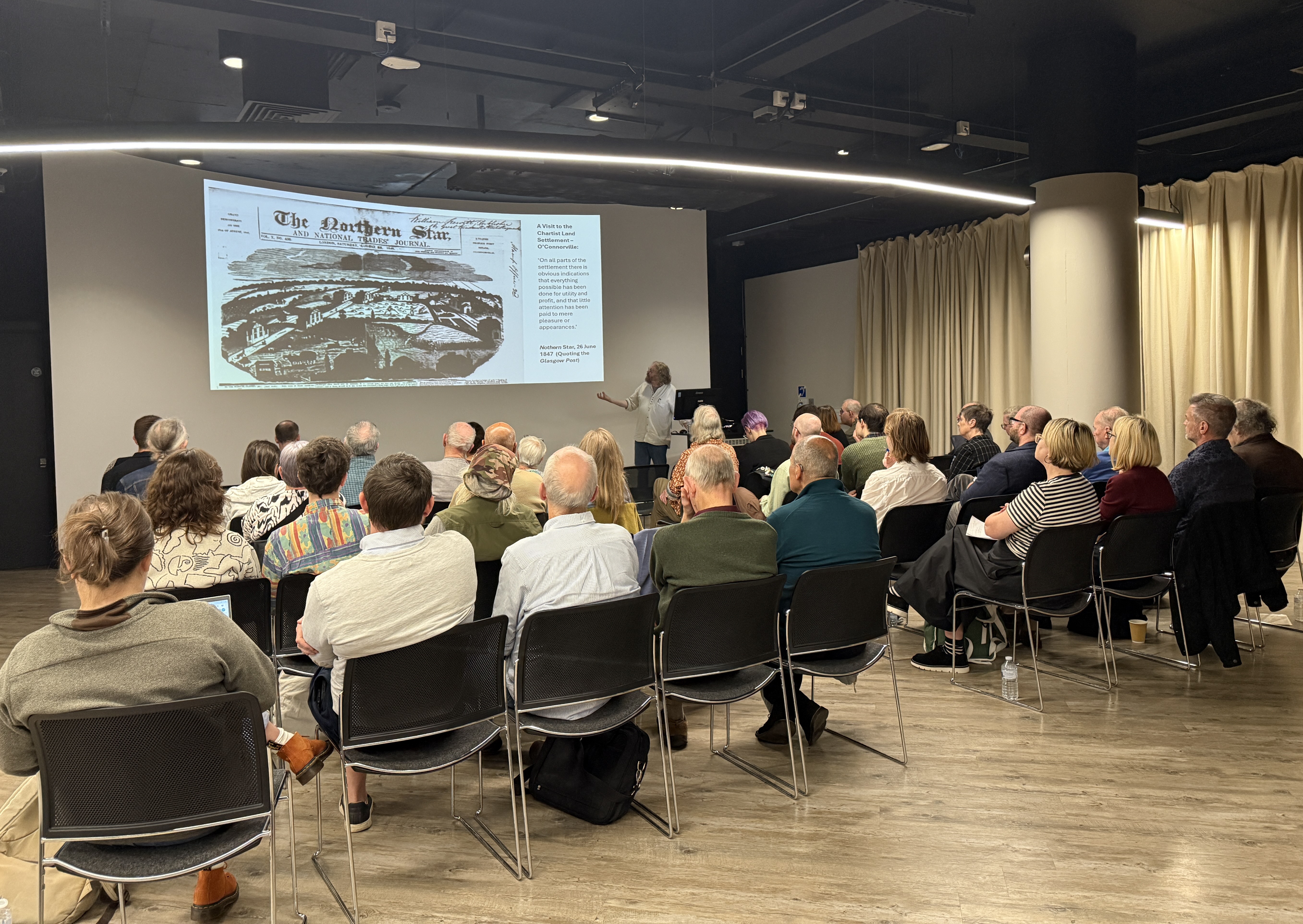 The first speaker, Dr Martin Wright, discussed the ways in which Chartists thought about ‘land’ and ‘landscape’, highlighting tensions between ‘picturesque’ and ‘anti-picturesque’ perceptions. The first of these, he suggested, was heavily influenced by the poetry of Shelley and the Romantics and revelled in the untended wilderness as something to be enjoyed in its own right. The second, based in the ideas of Thomas Spence, and finding its outlet in the Chartist land plan, abhorred untended land as a resource lost to ‘the people’s farm’.