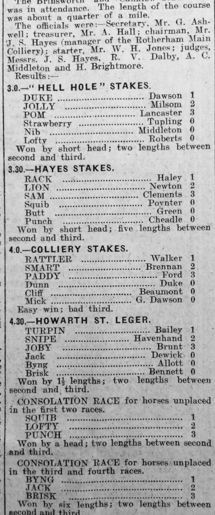 There was a total of six races and the Brinsworth and Canklow brass band played throughout the event. The first race, ran at 3.30pm, was the Hell Hole Stakes, and this was won by the pony Duke, read by Mr Dawson. (The Hell Hole was a part of Whiston and Canklow meadows). The second race was the Hayes Stakes, which was won by Rack, ridden by Haley. The third race, the Colliery Stakes, was won by Rattler ridden by Walker, and the fourth race, the Howarth St. Ledger was won by Turpin ridden by Bailey. In the two following consolation races, Squib won the third, and Byng the fourth.[6]