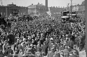 By the beginning of August, both the seamen’s and dockers’ unions were recognised by the employers, leading to a sharp increase in union membership. Little time was left to let the dust settle, as the city’s railway workers soon organised unofficial strike action, leading to a city-wide general transport strike. ‘In Liverpool’, the historian Ralph Darlington has explained, the ‘immediate issue was the question of solidarity action by other transport workers, despite the fact that dockers and other waterside workers had just returned to work’. A joint strike committee, led by the legendary trade unionist Tom Mann, organised the city’s largest public demonstration at St George’s Plateau. Around 80,000 people gathered for a rally on 13 August 1911, with Mann (pictured above) the main speaker, calling for unity amongst the city’s industrial workers. The event set the scene for what became known as ‘Bloody Sunday’, when a violent riot between demonstrators and the police broke out in front of Lime Street Station. The police, Darlington notes, ‘used a scuffle on the outskirts of the rally as an excuse for launching indiscriminate baton charges’, whilst the press focused on the supposed alcoholism of the striking workers as an explanation for the eruption of violence. Over three hundred people received injuries and close to one hundred were arrested in the aftermath. A few days later, two civilians were fatally shot by troops and ten others were injured. After much violence, the government entered negotiations, and on 22 August the city’s railway workers went back to work, with most of their demands met. The event was an important moment in the city’s self-perception and, for many of the city’s unionists and radicals, a symbol of Liverpool’s potential to overcome sectarianism and achieve material gains through joint action.