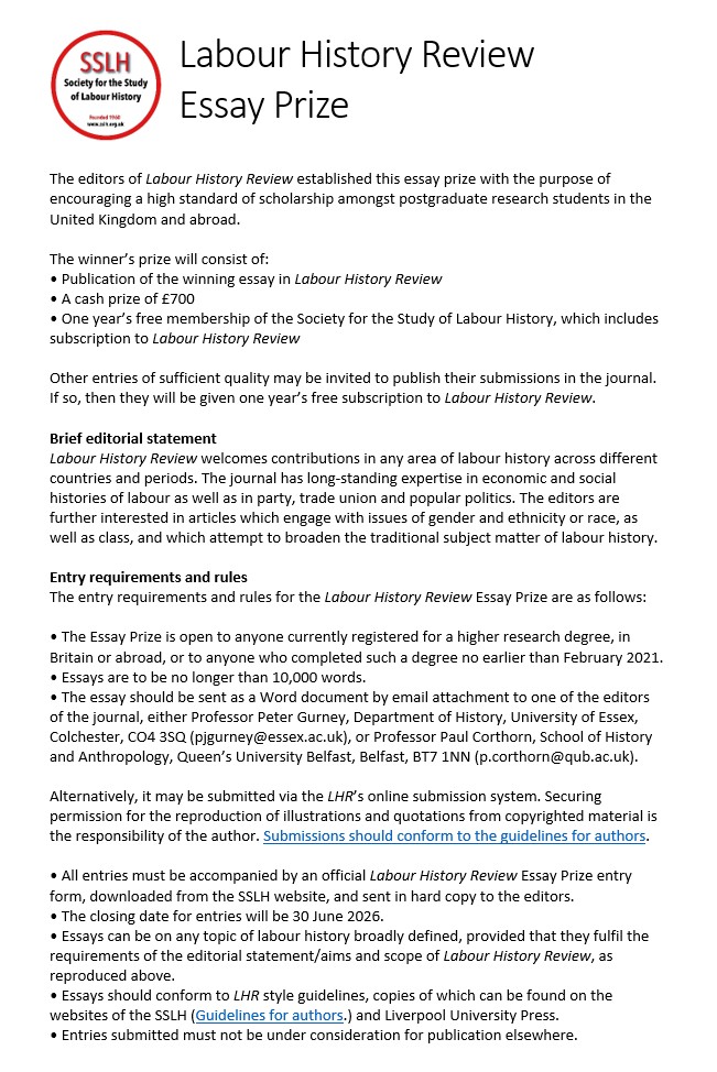 - All entries must be accompanied by an official Labour History Review Essay Prize entry form, downloaded from the SSLH website, and sent in hard copy to the editors.