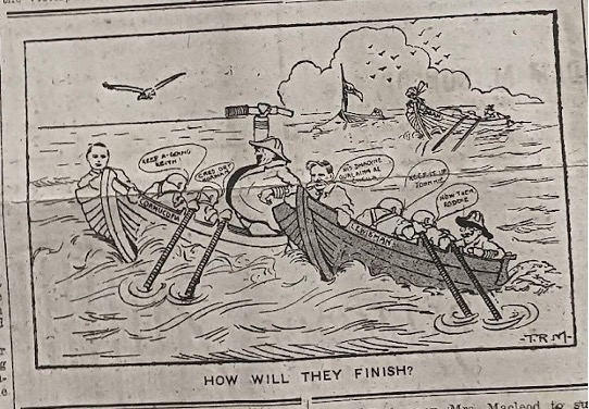Cartoon showing the electoral candidates for the 1918 Western Isles General Election. The two boats at the forefront show National Liberal Candidate, William Cotts (left), and, eventual winner, Independent Liberal, Dr Donald Murray (right). Someway at the back, Labour and Land League candidate, Hugh MacCowan, can be seen.