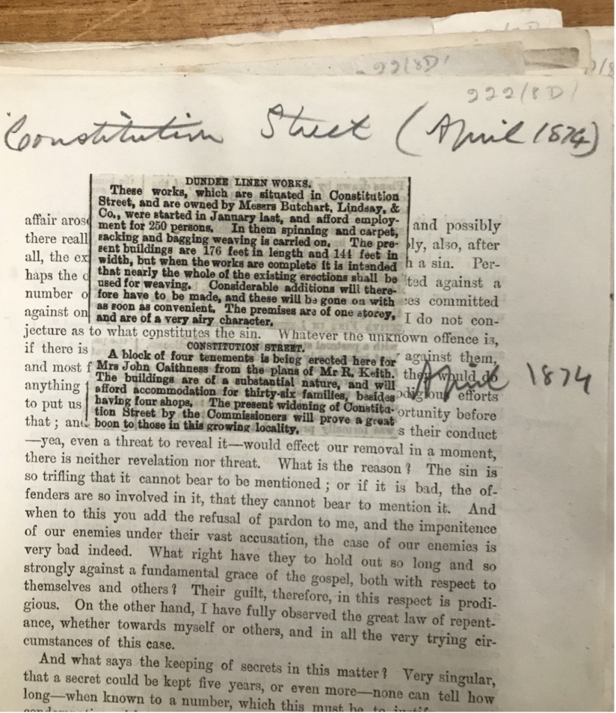 In-person archival visits were the only way I could truly get to the heart of the city. Uncovering the consequences of Dundee’s living and working conditions examining how the city ‘actually existed’ for contemporary Dundonians, and the extent to which Dundee’s development facilitated the growth of mutual aid networks among the Irish diaspora. Records such as the image shown below, preserved in the Lamb Collection, document and reflect on changes in the nineteenth-century cityscape.